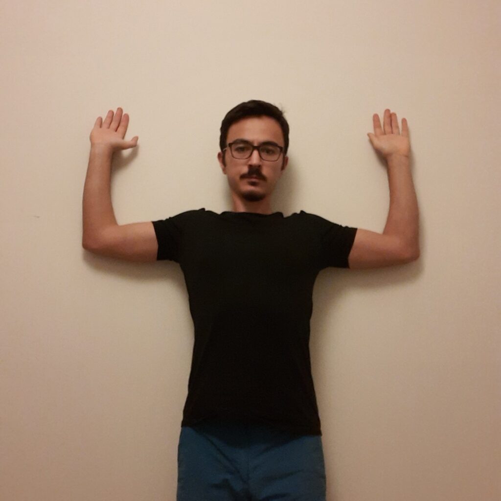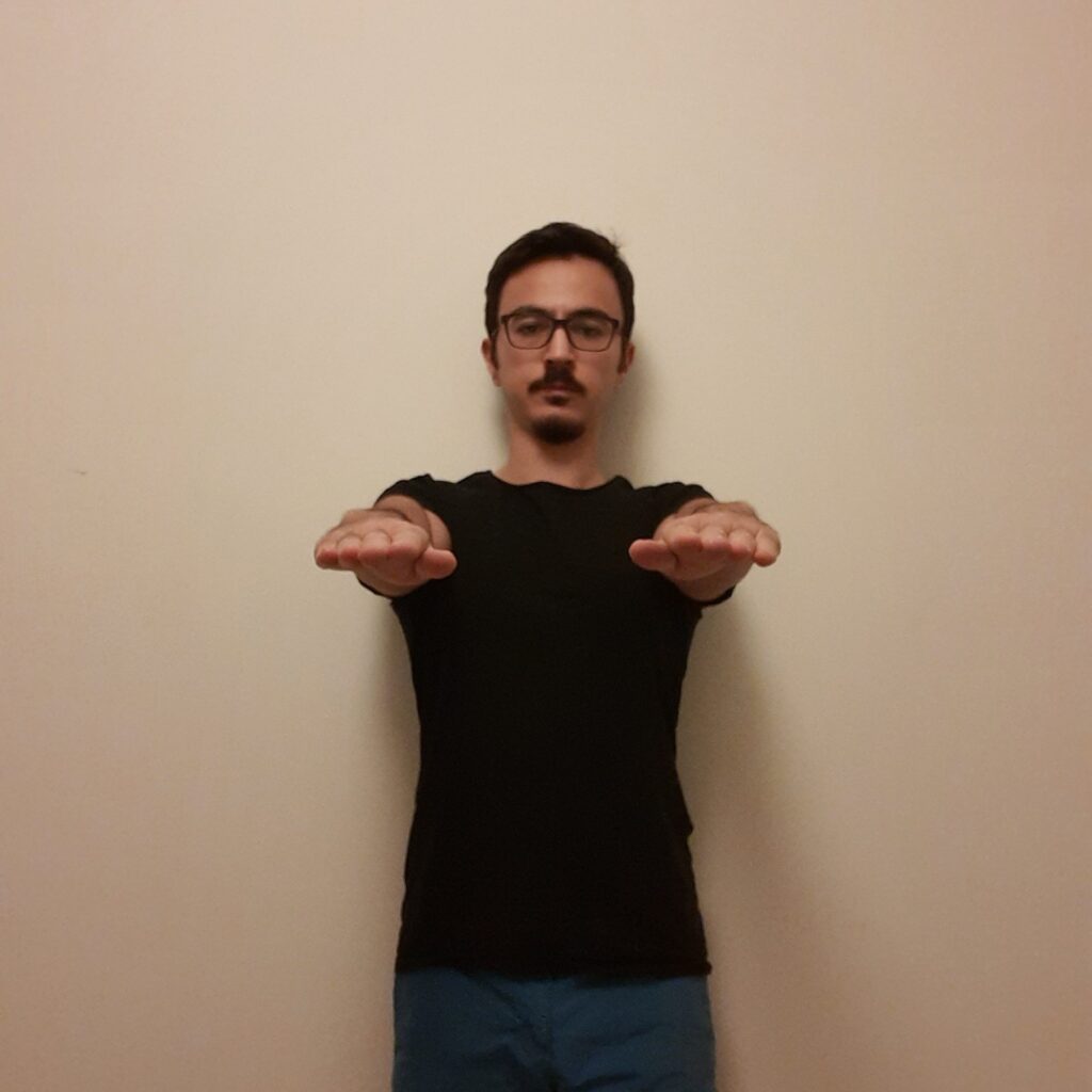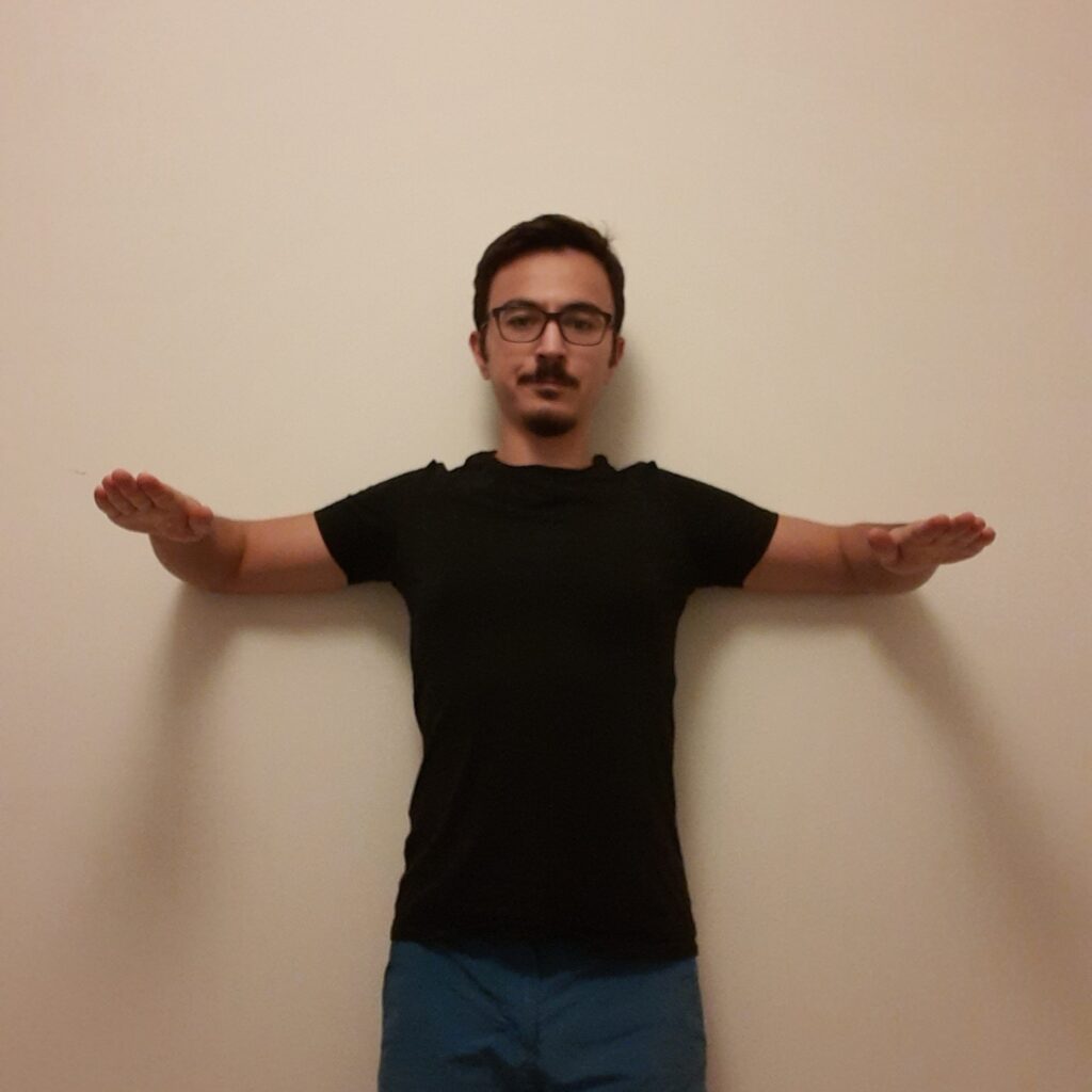 Ayaktayken kalçanızı ve üst omurganızı hafifçe duvara yaslayın. Duvarla teması yitirmeden avuç içleri yere bakacak şekilde kollarınızı öne doğru yere paralel uzatın. Ardından sadece üst kolunuzu geri çekerek dirseklerinizi duvara değdirin. Son adımda Avuç içleri karşıya bakacak şekilde ellerinizi kaldırın ve ellerinizin arkasını duvara değdirmeye çalışın.