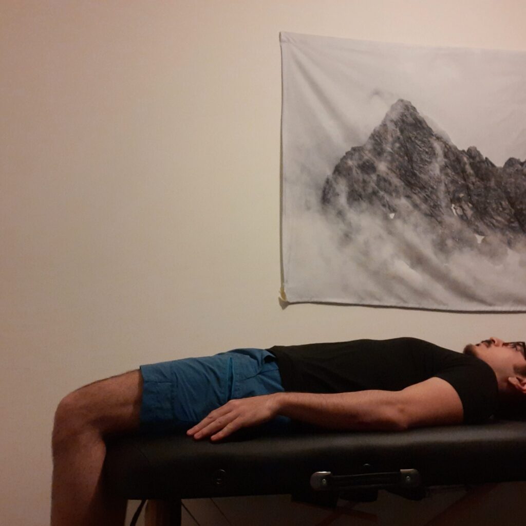Sırt üstü pozisyonda bacaklarınız diz seviyesinden itibaren boşlukta kalacak şekilde yatın. Ardından bir dizinizi iki elinizde kavrayarak karnınıza doğru çekin ve sıkıca bastırın.