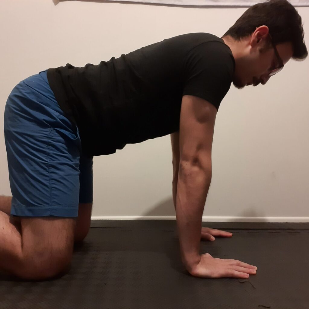 Emekleme pozisyonunda parmaklarınız açık ve ileri bakar şekilde ellerinizi yere koyun ve ağırlığınızı ellerinize doğru kaydırın.